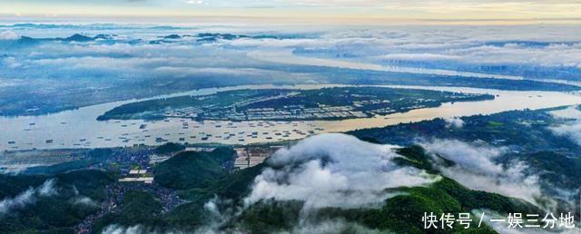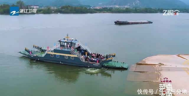 航拍镜头中,渡船缓缓离岸,穿越富春江,江面上有货船驶过,漾起悠扬, 江面开畅、风景秀气,远方即是五丰岛体育游戏app平台,一派绿意盎然 。