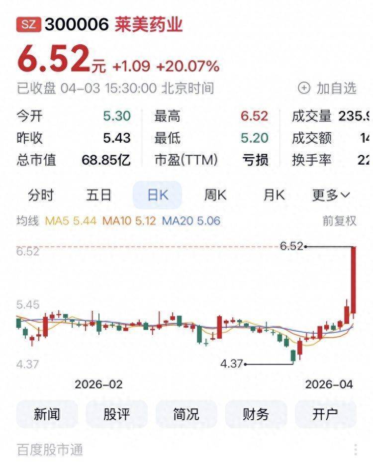 莱好意思药业报收6.52元,日涨幅20.07%,换手率22.34%,周涨幅28.60%,本年以来涨幅26.85%。